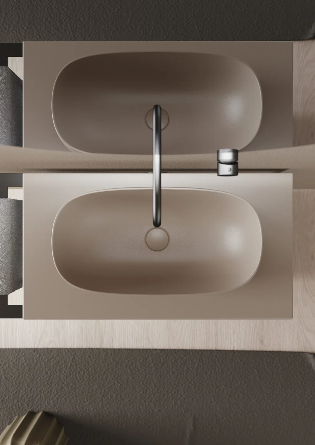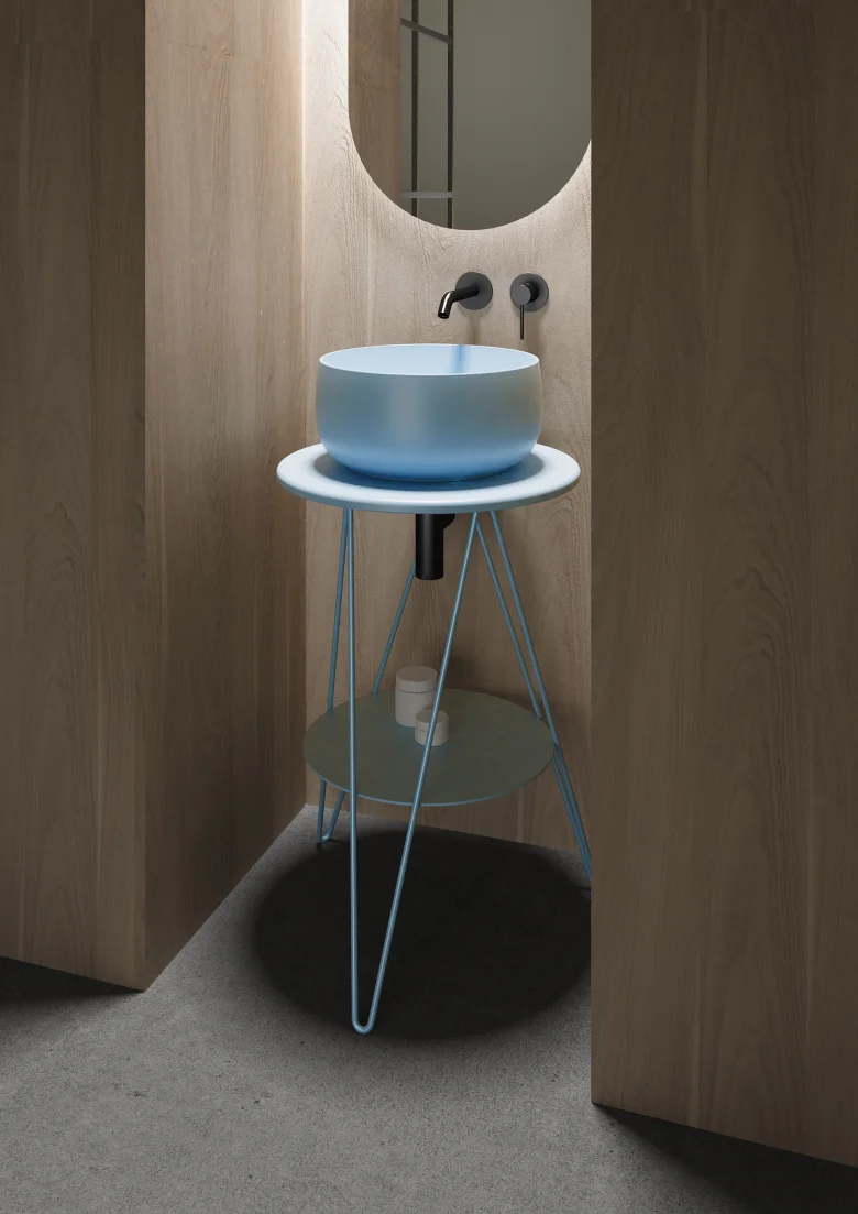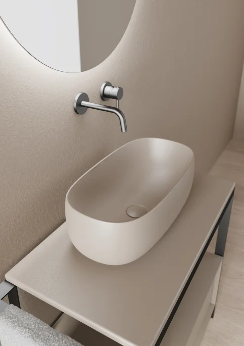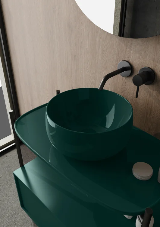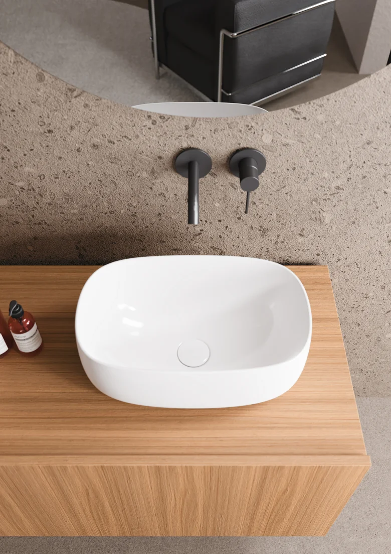 Un lavabo pensato per integrarsi armoniosamente con piani in legno o ceramica.